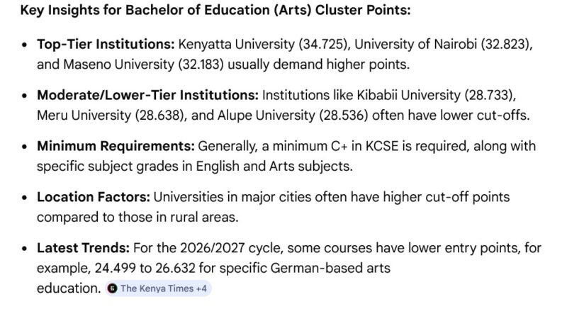 Bachelor of Education Arts Cut off points in Kenya